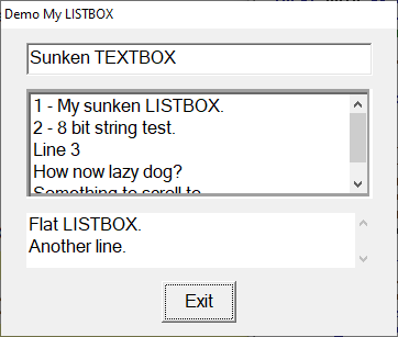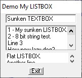 AddSunkenListbox (hDlg, %ID_LBUT, 10, 22, 140, 40, Items())